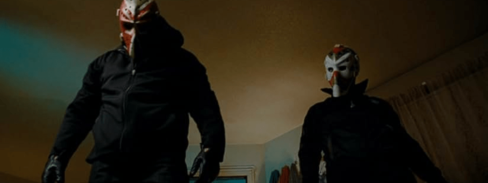 They hide their faces with hockey masks, which is ironic because Doug got kicked off a professional hockey team because of his on-court antics. They disguise their voices as someone the resident might know. They break in, beat up the two men in the apartment, and then attempt to leave. However, true to form, James gets hasty and greedy for the opportunity to do more than what was required in the situation, shoots the one guy in the leg twice, and then both men leave.